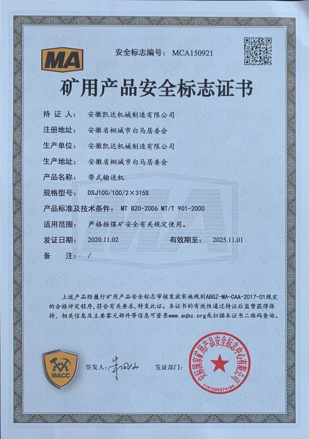 礦用產(chǎn)品安全標(biāo)志證書-帶式輸送機(jī)49